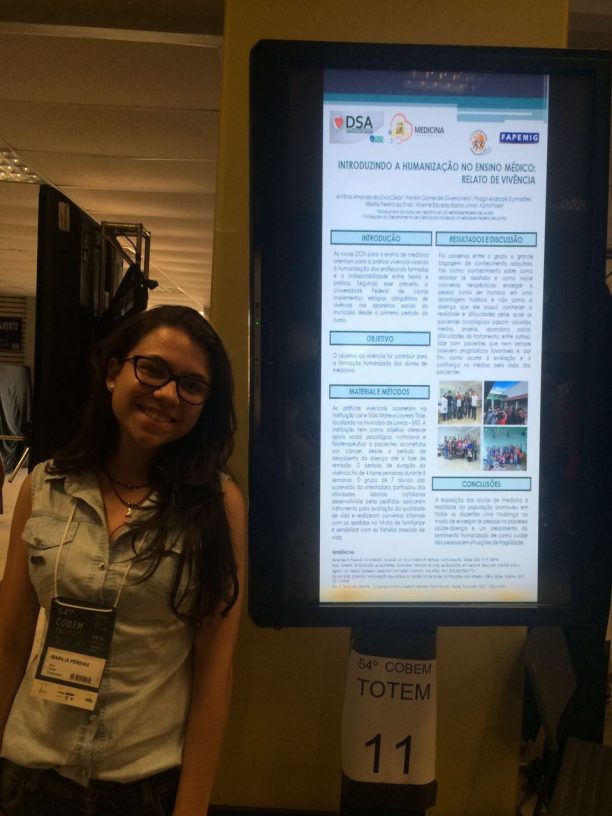 O Programa Mais Médicos (PMM) é parte de um amplo esforço do Governo Federal para a melhoria do atendimento aos usuários do Sistema Único de Saúde (SUS). Integram o Programa um plano de expansão da graduação e da residência médica, além de importantes mudanças no modo de formar médicos e especialistas. O curso de Medicina da Universidade Federal de Lavras (UFLA) faz parte dessa iniciativa e o êxito de seu desempenho acaba de ser confirmado durante o 54º Congresso Brasileiro de Educação Médica (Cobem), realizado de 12 a 15 de outubro, em Brasília. A UFLA foi uma das instituições convidadas para apresentar a experiência de implantação do curso no maior evento organizado pela Associação Brasileira de Educação Médica (Abem), no painel – Experiências Exitosas de Novas Escolas Médicas. A Medicina da UFLA foi uma das quatro escolas médicas destacadas, contemplando as novas Diretrizes Curriculares Nacionais (DCNs) e as diretrizes do Programa Nacional de Expansão das Escolas Médicas. A apresentação foi feita pela professora Joziana Barçante, presidente da Comissão de Implantação do curso de Medicina da UFLA, que destacou o orgulho de verificar que os caminhos escolhidos pelo grupo para a implantação têm resultado em ótimo desempenho. “O interessante foi receber a avaliação positiva no mais importante fórum de discussão sobre o ensino da Medicina, onde estavam reunidos coordenadores, professores, preceptores, estudantes e profissionais da saúde”, considerou.