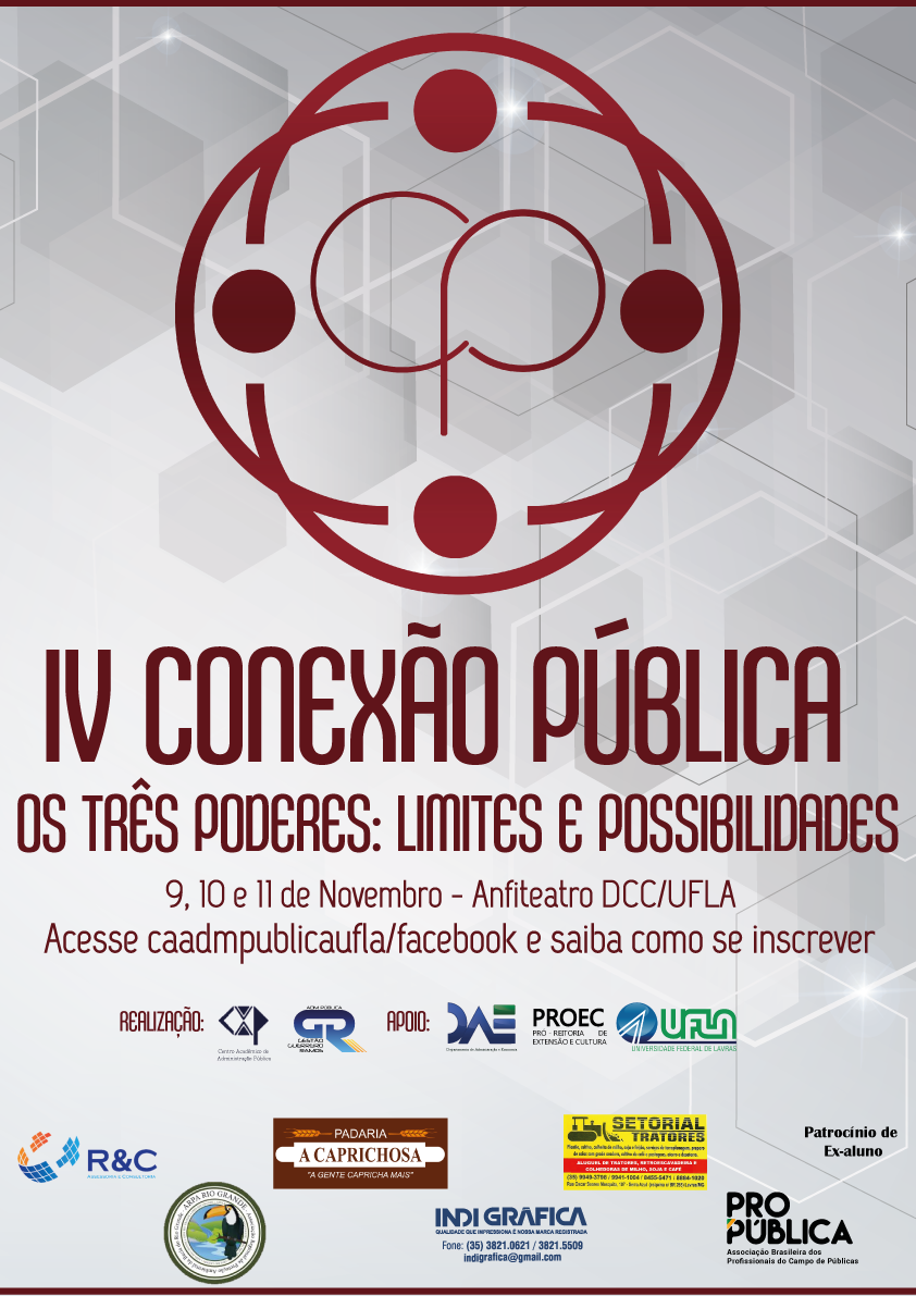 Nos dias 9, 10 e 11 de novembro ocorrerá a quarta edição do Conexão Pública, evento promovido pelo Centro Acadêmico de Administração Pública (CenAAP) da Universidade Federal de Lavras (UFLA). O tema central desta edição será “Os Três Poderes do Estado: desafios e possibilidades”. Graduandos, pós-graduandos, egressos e professores do curso de Administração Pública são convidados a participar. O evento também é aberto a toda a comunidade interessada pela temática.