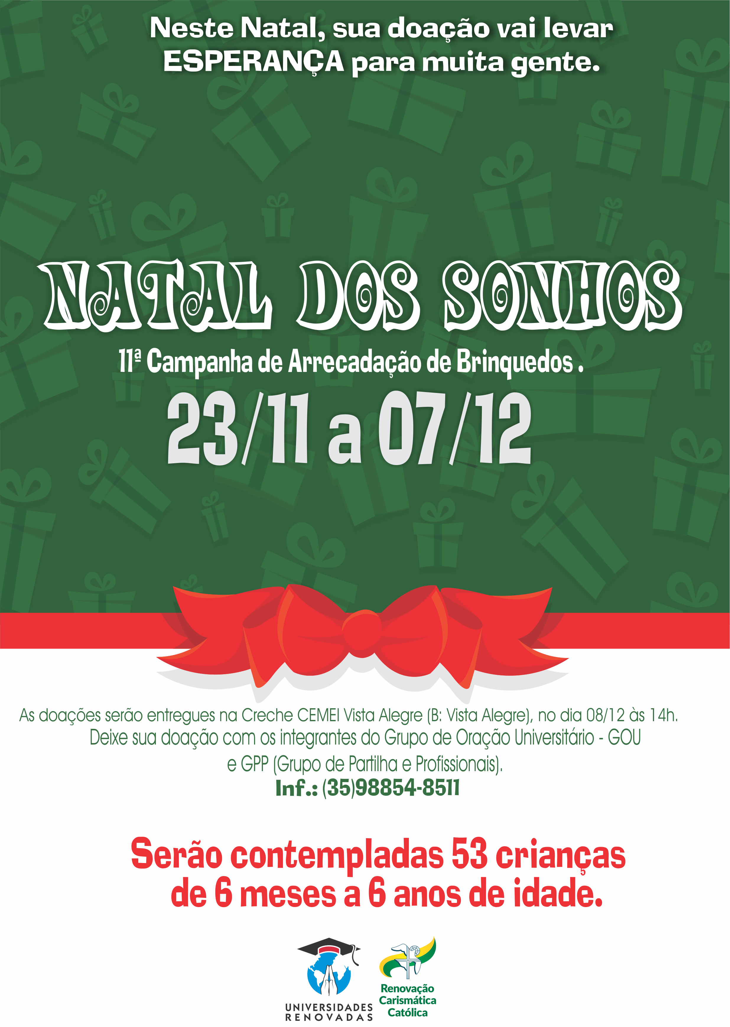 O Ministério Universidades Renovadas (MUR), formado pelos Grupos de Oração Universitários (GOU’s) e Grupos de Partilha e Perseverança (GPP’s) da Universidade Federal de Lavras (UFLA) irá promover o “11º Natal dos Sonhos”. Essa iniciativa tem buscado contemplar uma creche municipal, a cada ano, com a entrega de brinquedos arrecadados nas universidades e faculdades da cidade.