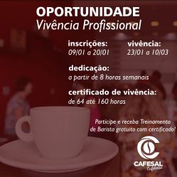 O período de vivência será de 23/1 a 10/3 e a CafESAL emitirá certificado de Treinamento de Barista e certificado de Vivência Profissional ao participante que cumprir integralmente as 8 semanas, contabilizando as horas dedicadas.