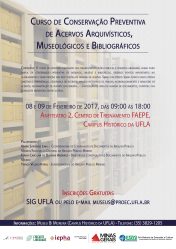 O curso será ministrado por especialistas e técnicos do Arquivo Público Mineiro (APM) e, abordará aspectos da conservação preventiva em arquivos, museus e bibliotecas, por meio de discussões e reflexões de temas como: plano contra sinistros e emergências, segurança de acervos, manejo integrado de pragas, acondicionamento e manuseio de acervos, reformatação de suporte documental, climatização de área de guarda de documentos, controle das condições ambientais, entre outros.