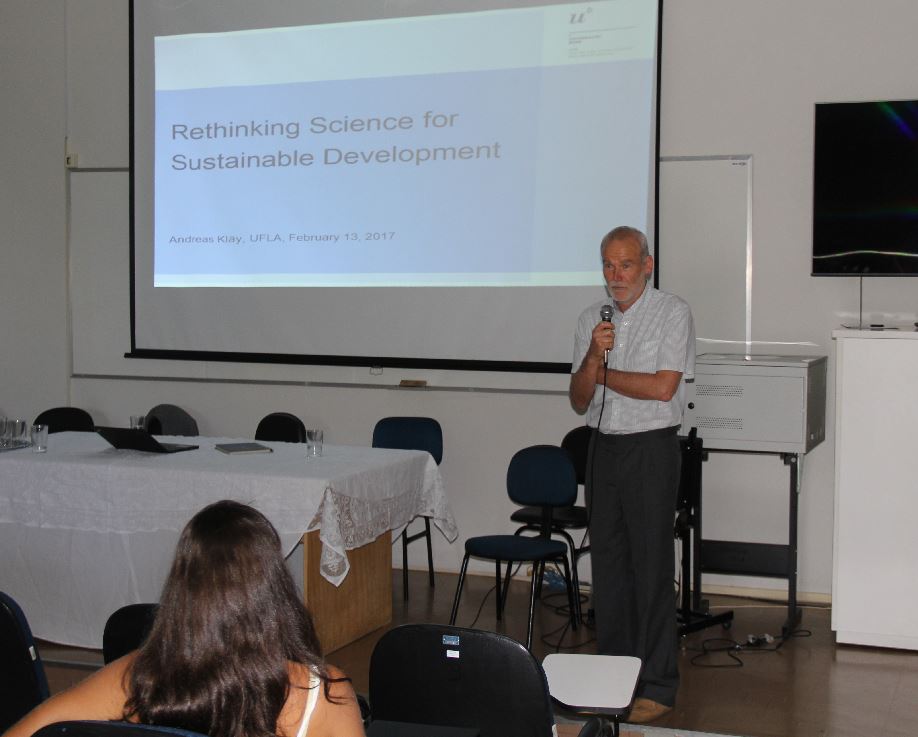 Em seguida, a abordagem foi Rethinking Science for Susteinable Development, conduzida por Andreas Kläy, um pesquisador e extensionista que possui reconhecimento internacional pela inovação conceitual e metodológica na área de desenvolvimento sustentável, especialmente, no que diz respeito à metodologia “Learning for Sustainability (LforS): desenvolvimento conceitual e moderação de processos de aprendizagem”. Andreas Kläy proferiu, ainda, uma segunda palestra, já no dia 14/2, com o tema “Centre for Development and Environment CDE – projetos e parcerias entre UFLA e Universidade de Berna”.