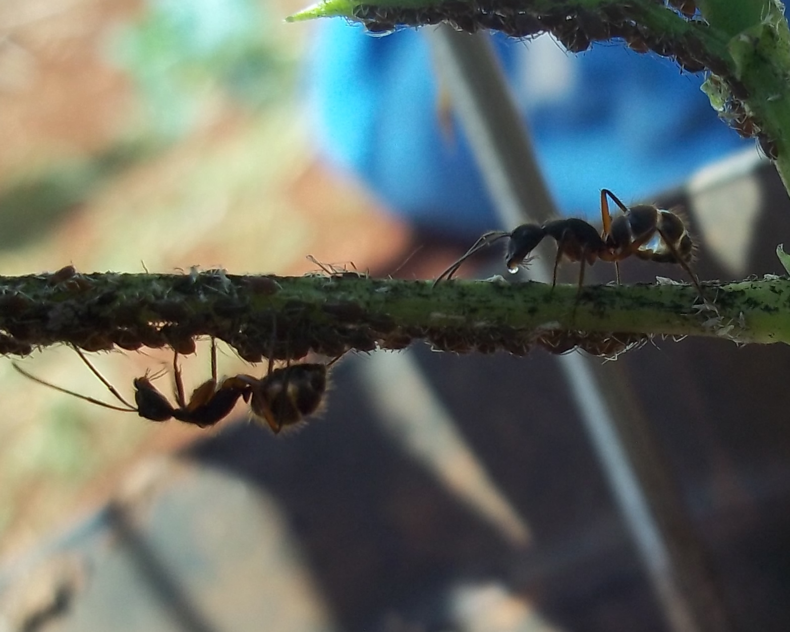 “Um dos principais alimentos que a formiga precisa para obter energia é o carboidrato e quando interagem com pulgões elas o obtêm através de um líquido excretado pelos pulgões. Estes alimentam-se da seiva das plantas e produzem um líquido açucarado, conhecido como honeydew”, explica o pesquisador Ernesto Cañedo Júnior, doutorando em Entomologia na UFLA. As formigas “cuidam” dos pulgões, protegendo-os de inimigos naturais, transportando-os, limpando o excesso do líquido excretado e, em certos casos, alimentam-se deles. “É como se os afídeos fossem ‘vacas de leite e corte’ para as formigas”, compara Ernesto. O consumo do honeydew pelas formigas também beneficia a planta e o pulgão, porque o acúmulo do líquido leva à proliferação de fungos que podem matar os afídeos e que prejudicam a fotossíntese dos vegetais.