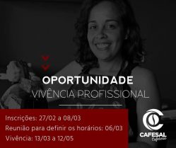 A Cafeteria Escola “CafESAL”, da Universidade Federal de Lavras (UFLA), abre inscrições para o processo seletivo da segunda Vivência Profissional. As inscrições podem ser feitas até dia 8/3.