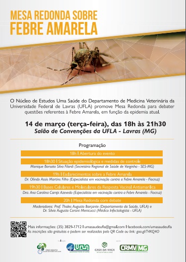 O Núcleo de Estudos “Uma Saúde” do Departamento de Medicina Veterinária da Universidade Federal de Lavras (DMV/UFLA) realizará nesta terça-feira (14/3) a Mesa Redonda sobre Febre Amarela, com a presença de especialistas da Fundação Oswaldo Cruz (Fiocruz), a Secretária Regional de Saúde de Varginha, dentre outros profissionais da área.