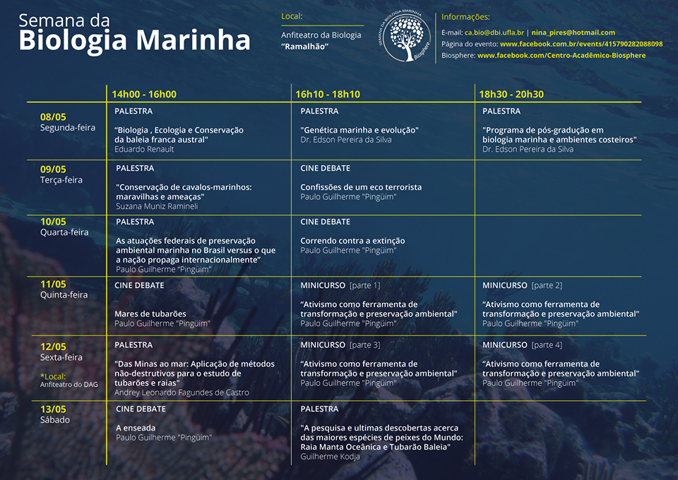 Entre os dias 8 e 13 de maio ocorrerá a Semana de Biologia Marinha da Universidade Federal de Lavras (UFLA). Promovido pelo Centro Acadêmico de Biologia (Biosphere), as atividades serão realizadas no Anfiteatro do Departamento de Biologia - Ramalhão (DBI/UFLA).