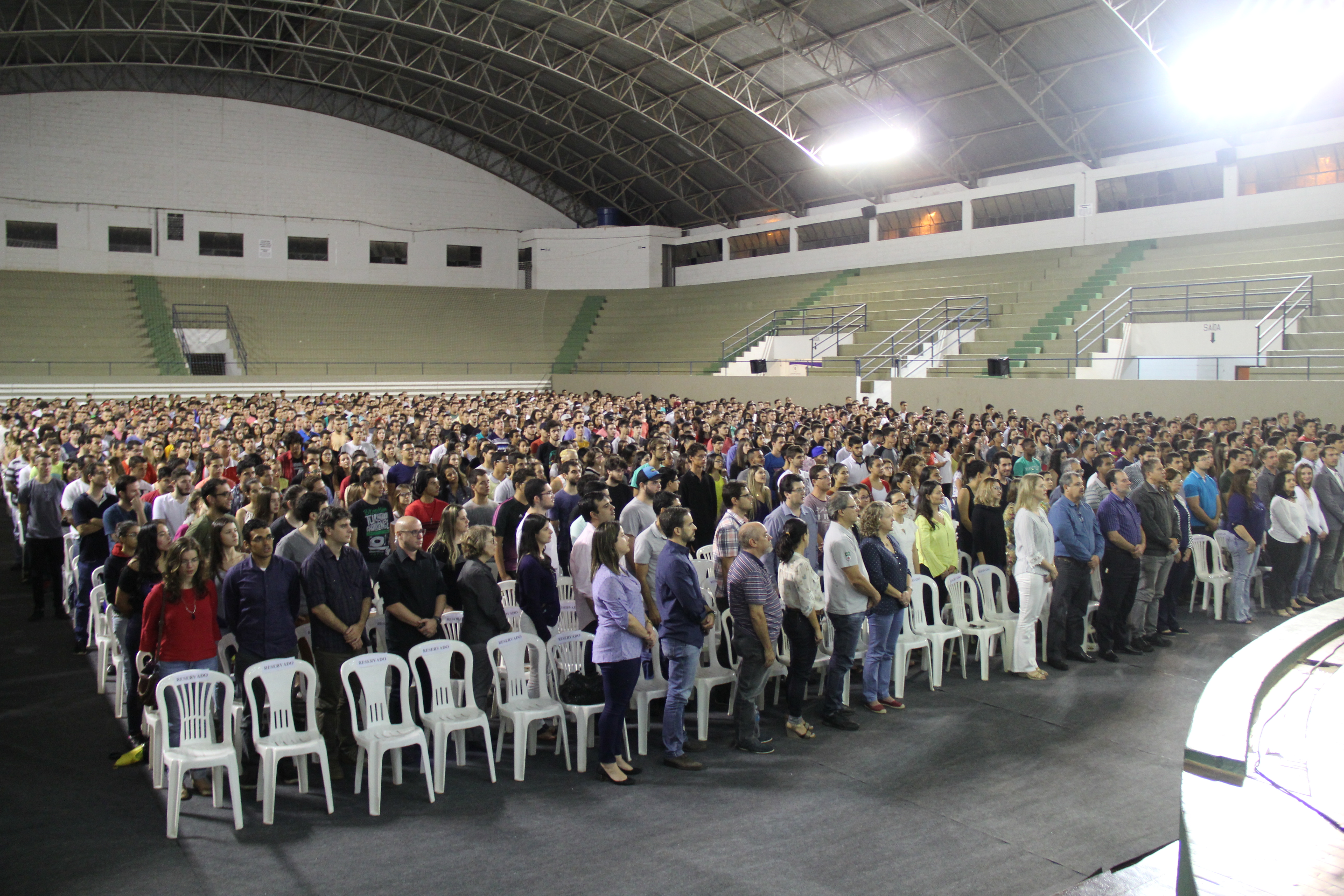 O primeiro período letivo de 2017 começou na Universidade Federal de Lavras (UFLA). Um dos eventos que marcou o início das aulas é o encontro dos calouros com o reitor da instituição, professor José Roberto Soares Scolforo. Ao todo, 1428 estudantes de 29 cursos presenciais de graduação se reuniram nessa quinta-feira à noite (27/4), no Ginásio Poliesportivo, e foram recepcionados por integrantes das pró-reitorias e das coordenações de curso.