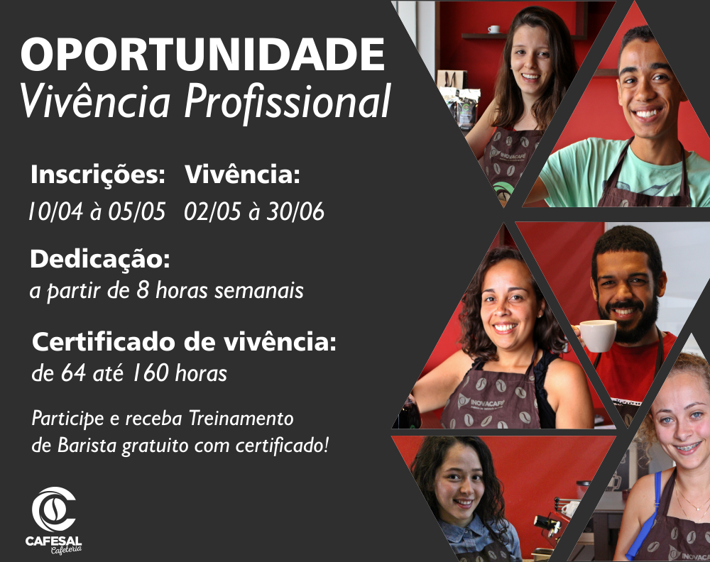 O período da vivência será de 2/5 a 30/6 e a “CafESAL” emitirá certificados de Treinamento de Barista e Vivência Profissional ao participante que cumprir integralmente a carga horária de oito semanas.