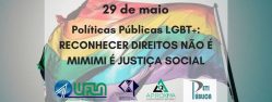 Será realizado na próxima segunda-feira (29/5) o evento “Políticas Públicas LGBT+: Reconhecer os direitos não é ‘mimimi’, é justiça social”. O evento será organizado pelo Centro Acadêmico e PETI do curso de Administração Pública e terá como principal objetivo discutir sobre Políticas Públicas LGBT+ em um panorama atual, que conduz diretamente ao processo de construção dos mecanismos e acontecimentos políticos e sociais do movimento LGBT+ no Brasil.