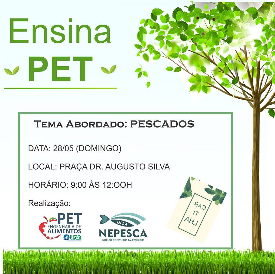 O Programa de Educação Tutorial em Engenharia de Alimentos (PET Engenharia de Alimentos) promoverá no próximo domingo (28/5) a 6ª edição do EnsinaPET. Com o tema "Pescados", o evento ocorrerá das 9h às 12h na Praça Dr. Augusto Silva, em Lavras/MG.