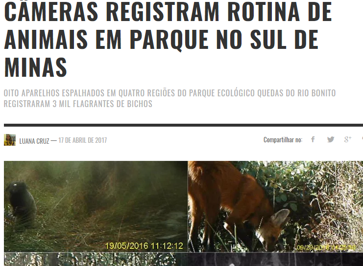 A terceira pesquisa destacada no blog Minas Faz Ciência retrata o registro fotográfico de animais silvestres no Parque Ecológico Quedas do Rio Bonito, em Lavras. O trabalho foi realizado pela estudante do curso de biologia Ellen Cristina Mões Oliveira e teve a orientação do professor Antônio Carlos da Silva Zanzini, do Departamento de Ciências Florestais (DCF).