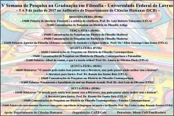 As atividades da V Semana de Pesquisa na Graduação em Filosofia da Universidade Federal de Lavras (UFLA) estão em curso. Até a próxima sexta-feira (9/6) são oferecidas palestras e minicursos para estudantes e a comunidade em geral.