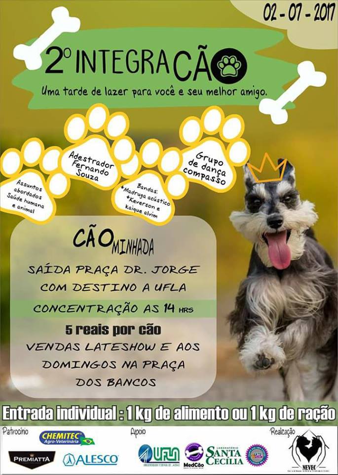 O IntegraCÃO, que tem como objetivo unir ações de saúde e lazer entre os seres humanos e seus melhores amigos, será realizado no dia 2 de julho. Seguindo o mesmo formato da primeira edição, o evento terá início às 14h com a CÃOminhada, onde os cachorros com seus tutores saem da praça Dr. Jorge e caminham em direção à UFLA, na quadra da moradia estudantil, onde são realizadas as demais atividades.