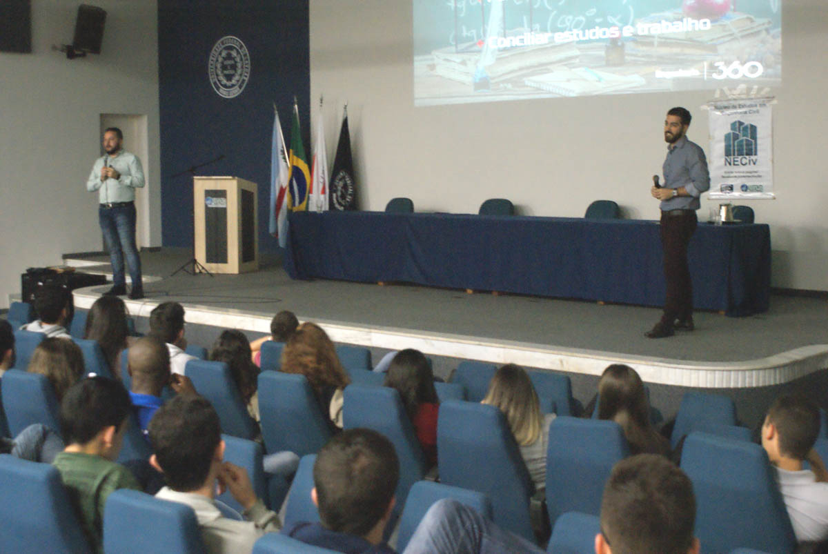 O Núcleo de Estudos de Engenharia Civil (Neciv) realizou ontem (28) um ciclo de palestras, com o tema “A Engenharia dentro e fora da universidade”. A primeira delas contou com a presença dos engenheiros e empresários Eduardo Cavalcanti e Eduardo Mikail, fundadores do Blog da Engenharia e outras plataformas de comunicação sobre a área na internet.