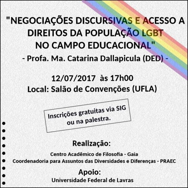 Na próxima quarta-feira, 12 de julho, às 17h, será realizada na Universidade Federal de Lavras (UFLA) a palestra "Negociações discursivas e acesso a direitos da população LGBT no campo educacional", no Salão de Convenções. O evento é gratuito e aberto a todo público. As inscrições podem ser realizadas pelo Sistema Integrado de Gestão (