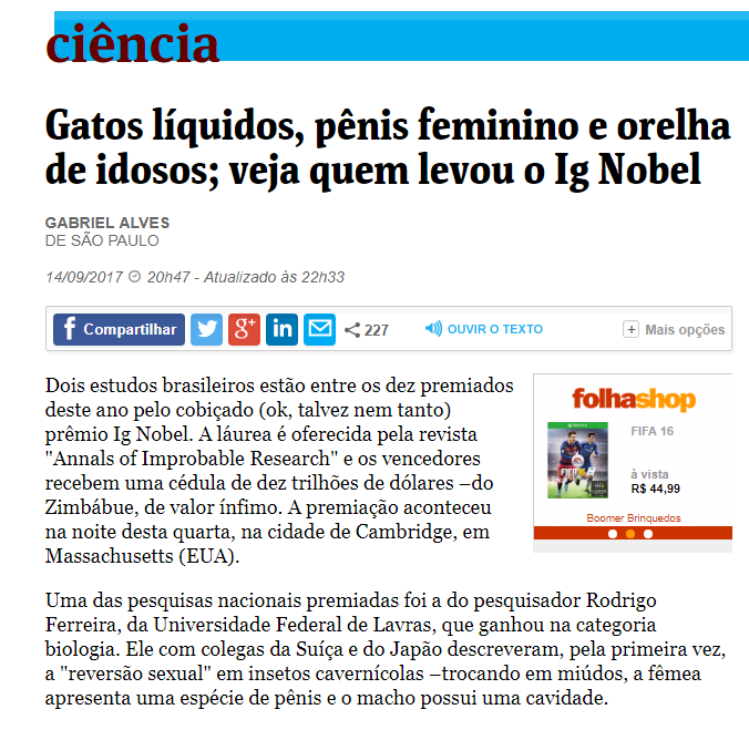 UFLA na Mídia: professor do DBI recebe prêmio Ig Nobel e é destaque nos principais sites de notícias brasileiros