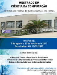 O Departamento de Ciência da Computação (DCC) da Universidade Federal de Lavras (UFLA) informa que estão abertas as inscrições do programa de pós-graduação (mestrado). Os candidatos podem se inscrever até 13 de outubro, no site na Pró-Reitoria de Pós-Graduação (http://www.prpg.ufla.br/prpg2010/).