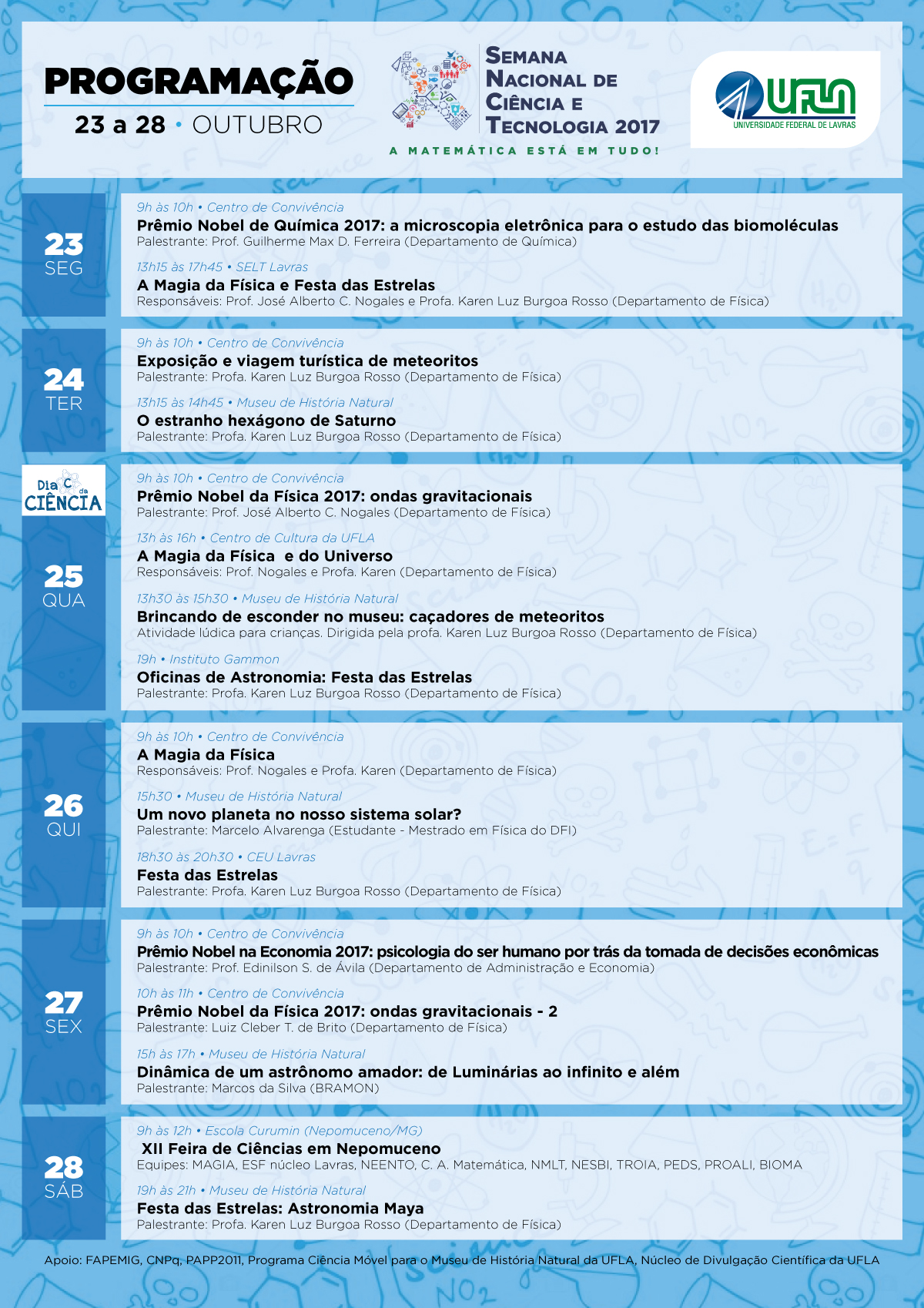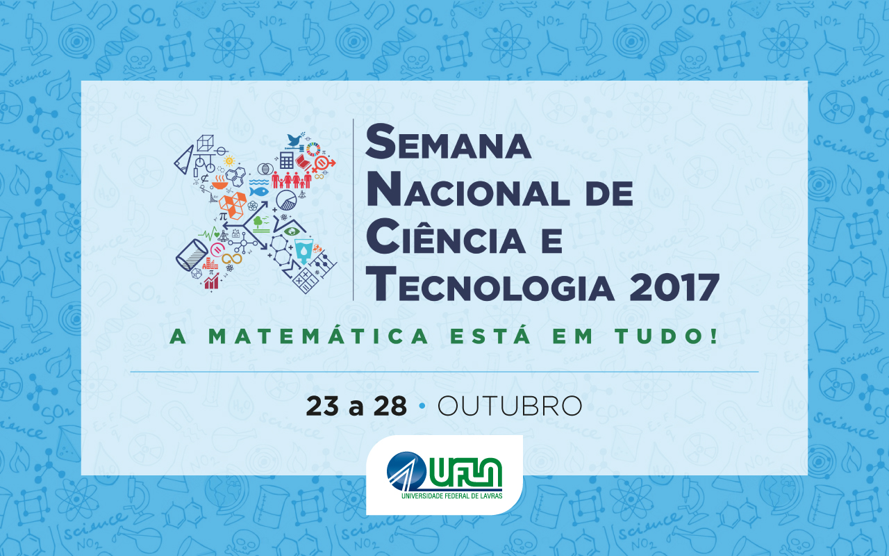A Universidade Federal de Lavras (UFLA), por meio da Pró-Reitoria de Pesquisa (PRP), realizará de 23 a 28 de outubro uma programação especial na celebração da Semana Nacional de Ciência e Tecnologia (SNCT). Serão realizadas palestras, demonstrações experimentais, e exposições na UFLA, em escolas de Lavras e Nepomuceno.