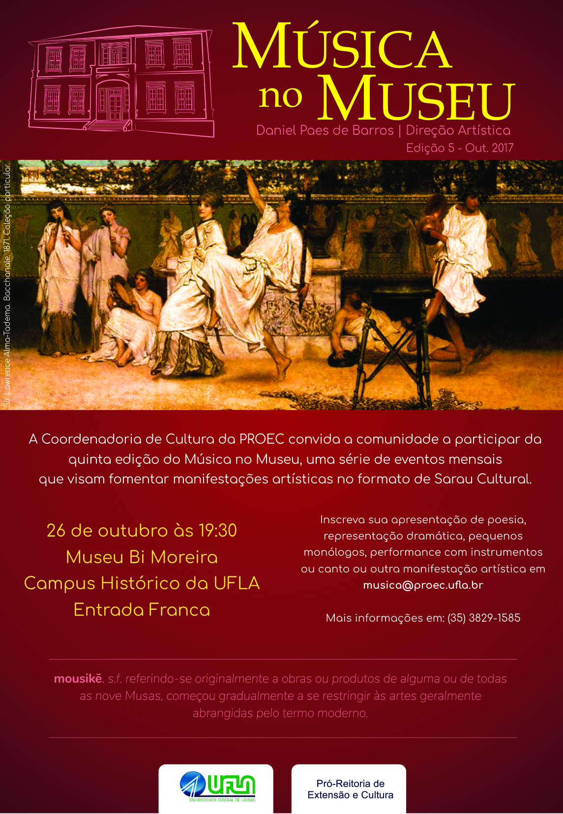 Na próxima quinta-feira (26/10), será realizada a quinta edição do Sarau Música no Museu, com início às 19h30. O evento ocorre mensalmente no Museu Bi Moreira, localizado no câmpus histórico da Universidade Federal de Lavras (UFLA).