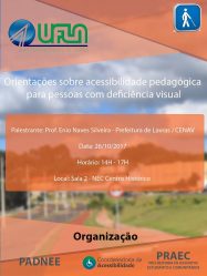 Com o objetivo de contribuir com reflexões acerca da acessibilidade pedagógica para estudantes com deficiência visual, a palestra será proferida pelo professor Enio Naves Silveira do Centro de Educacional e Apoio as Necessidades Auditivas e Visuais - CENAV Lavras.