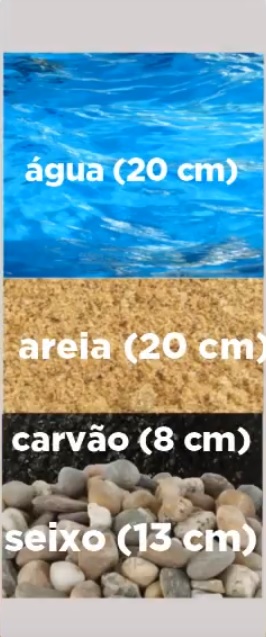 Fure o cano de PVC no diâmetro da torneira, aproximadamente 8 cm acima da base inferior do filtro, cole a tampa de PVC 300mm. Na base inferior do filtro, coloque 15 cm de brita ou seixos, como primeira camada, depois adapte 3 discos da tela mosquiteira com o mesmo diâmetro do tubo; sobre esta camada, acrescente 5 cm de fragmentos de carvão ativado ou 10 cm de carvão comum, como segunda camada; colocando novamente os 3 discos da tela mosqueteira, complete como última camada, 25 cm da areia e mais 4 camadas de tela mosqueteira; para finalizar, adapte o suporte de entrada da água bruta e lembre-se de renovar a água bruta a cada 24h, por 30 dias consecutivos, antes de consumir a água filtrada.