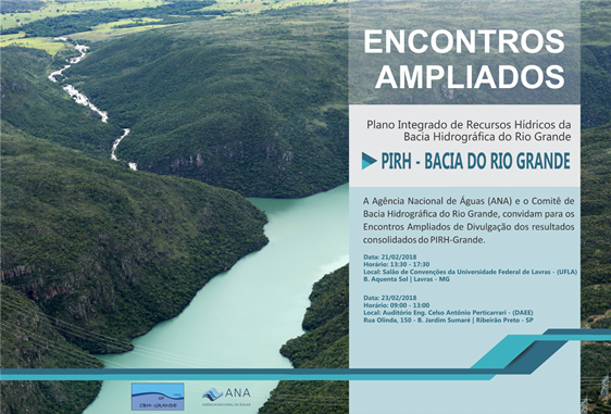 A Universidade Federal de Lavras (UFLA) sediará no dia 21 de fevereiro o Encontro Ampliado de Divulgação do Plano Integrado de Recursos Hídricos da Bacia Hidrográfica do Rio Grande (PIRH-Grande), no Salão de Convenções, às 13h30.