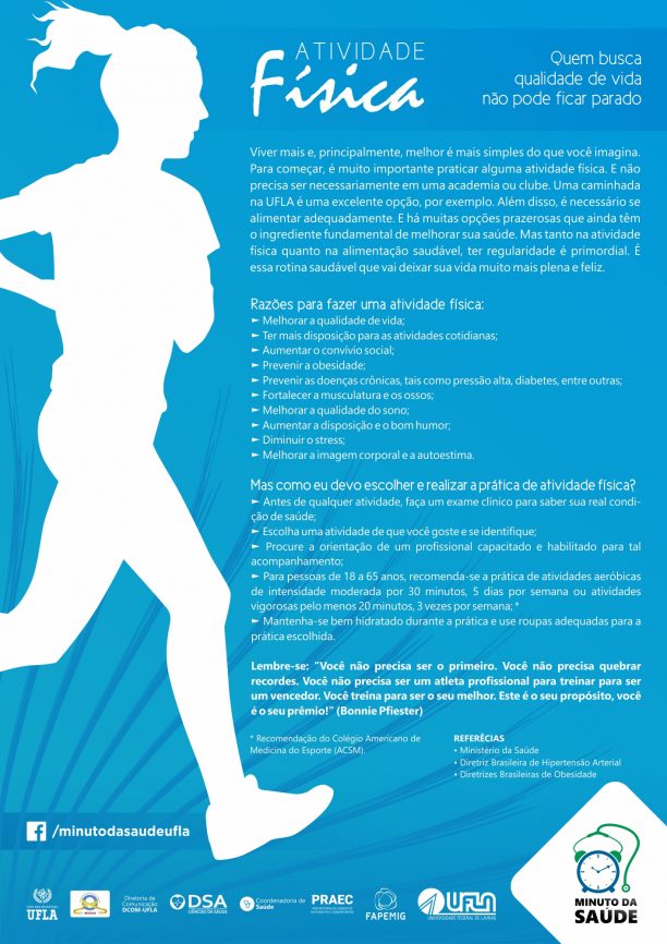 Para incentivar a prática de atividades físicas no meio universitário, o projeto Minuto da Saúde realiza na quarta-feira (18/4) a campanha “Quem busca qualidade de vida não pode ficar parado”, com oficinas e orientações ao público, no Centro de Convivência, em três momentos: