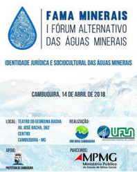Integrantes do Núcleo de Estudos em Administração Pública e Gestão Social (Neapegs), da Universidade Federal de Lavras (UFLA), estarão em Cambuquira (MG) no próximo sábado (14/4) para o I Fórum Alternativo das Águas Minerais (I FAMA Minerais). O evento é uma iniciativa da ONG Nova Cambuquira; e o Neapegs é parceiro. O objetivo é enriquecer reflexões que contribuam para o reconhecimento das águas minerais como direito humano. Estarão reunidos pesquisadores, Ministério Público, organizações da sociedade civil, órgãos governamentais, comunidade e outros atores e instituições.