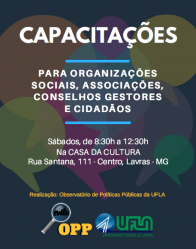 As capacitações têm como objetivo fortalecer e ampliar a participação cidadã na gestão pública na avaliação, definição e fiscalização das políticas públicas, bem como articular as redes de controle social no município de Lavras. A qualificação será feita de forma presencial, quinzenalmente aos sábados, das 8h30 às 12h30, na Casa da Cultura que fica na Rua Santana, número 111 , no Centro de Lavras. Serão tratados os seguintes temas: Poder, Política, Democracia e os Três Poderes (24/3), Direito, Cidadania e Políticas Públicas (7/4), Controle Social, Garantia de Direitos (28/4), Espaços Participativos, Conselhos Gestores de Políticas Públicas (12/5), Mecanismos Jurídicos (26/5), Marco Regulatório das Organizações da Sociedade Civil (2/6).