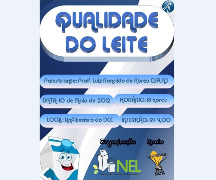 O Núcleo de Estudos em Laticínios (NEL) e o Departamento de Ciências dos Alimentos (DCA) promovem nesta quinta-feira (10), no anfiteatro do Departamento de Ciências da Computação, a palestra Qualidade do Leite, com a apresentação do professor Luiz Ronaldo de Abreu. A palestra terá início às 18 horas e vai abranger temas de interesse dos cursos de Medicina Veterinária, Zootecnia e Engenharia de Alimentos.