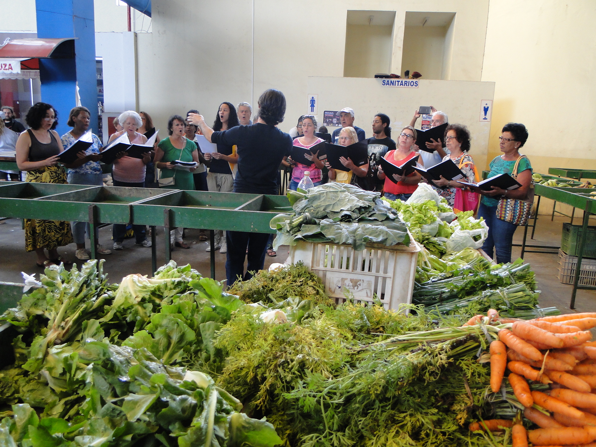 Aos poucos, os 35 integrantes do Coral foram se alinhando sob a regência do maestro Augusto Pimenta e o som começou a ecoar pelo mercado, chamando a atenção de todos para o estilo de música clássica, diferente do habitual.