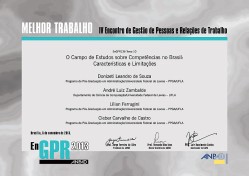 O IV Encontro de Gestão de Pessoas e Relações de Trabalho (EnGPR), promovido pela Associação Nacional de Pós-Graduação e Pesquisa em Administração (Anpad), foi realizado em Brasília (DF) de 3 a 5 de novembro. A cada edição, a organização premia um trabalho como o melhor do evento e o deste ano foi produzido na UFLA.
