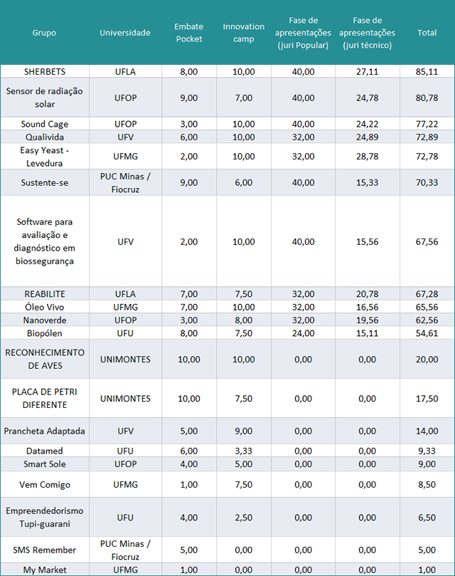 O Sistema Mineiro de Inovação (Simi) divulgou, no dia 13, a lista das equipes finalistas do Programa Mineiro de Empreendedorismo na Pós-Graduação. A proposta “Iron Sherbet”, desenvolvida na UFLA, é uma das cinco escolhidas, entre as 11 semifinalistas. Aliás, o plano de inovação lavrense chegou à última fase com mais pontos que os concorrentes.