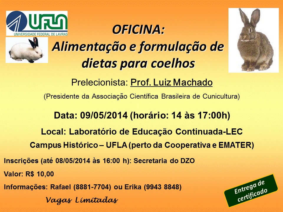 O tema será tratado pelo presidente da Associação Científica Brasileira de Cunicultura, professor Luiz Machado. As inscrições, para as quais há vagas limitadas, devem ser feitas na Secretaria do DZO, com um investimento de R$ 10,00. Está prevista a emissão de certificados para os participantes. Veja o cartaz que divulga a oficina.