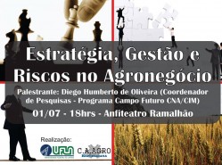 O Centro Acadêmico de Agronomia da Universidade Federal de Lavras (C.A. Agro/UFLA) organiza a palestra “Estratégia, Gestão e Riscos no Agronegócio”. O evento ocorrerá em 1º/7, às 18h, no Anfiteatro Professor Magno Antônio Patto Ramalho (Ramalhão), localizado no Departamento de Biologia (DBI). As inscrições, no valor de R$ 5,00, já podem ser feitas na Cantina Central.