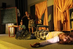 Com elenco, o diretor Ricardo Calixto agradece[/caption]A apresentação na UFLA teve no elenco, Amanda Ferres, Átila Nonato e Gabriel Amaral, que apresentaram com maestria o texto e agradaram o público presente. A peça “A lição – À procura do doutorado total” apresenta uma inteligente reflexão sobre relações humanas, em particular a relação professor-aluno. Através de diálogos aparentemente absurdos, o problema universal da falha de comunicação e a procura incessante pela informação são expostos de forma cômica, mas também dramática ou trágica.