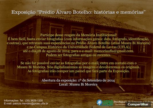 Membros da comunidade acadêmica - e da comunidade de Lavras - que possuam fotografias retratando experiências vividas no Museu Bi Moreira (antigo Prédio Álvaro Botelho), podem contribuir no resgate da memória dessa instituição. Está sendo feita uma campanha para que possíveis colaboradores enviem essas fotografias para o e-mail Este endereço de email está sendo protegido de spambots. Você precisa do JavaScript ativado para vê-lo. até o dia 28/8.