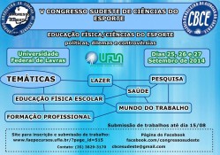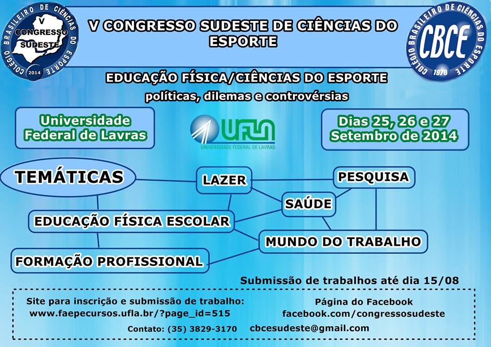 Será realizado na Universidade Federal de Lavras (UFLA), no Salão de Convenções, o V Congresso Sudeste de Ciências do Esporte, com atividades no período de 25/9 a 27/9. A organização é do Colégio Brasileiro de Ciências do Esporte (CBCE), associação científica filiada à Sociedade Brasileira para o Progresso da Ciência (SBPC). O evento é regional e ocorre a cada dois anos. Desde 1978, congrega as pesquisas e produções acadêmico-científicas da Educação Física/Ciências do Esporte no Brasil.