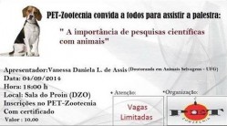 O Programa de Educação Tutorial Institucional (PET)/Zootecnia promoverá em 4/9 a palestra “A importância de pesquisas científicas com animais”. Quem abordará o tema é a doutoranda em Animais Selvagens pela Universidade Federal de Goiás (UFG), Vanessa Daniela de Assis.