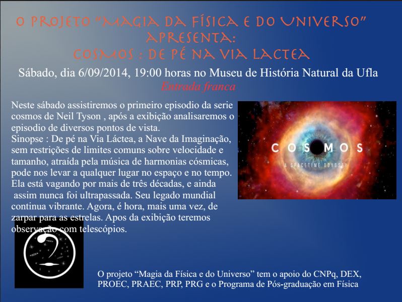 A oficina “Festa das Estrelas”, organizada pela equipe do projeto “A Magia da Física e do Universo”, iniciará neste sábado (6/9) a exibição da série “Cosmos”, de Neil Tyson. O documentário de estreia é “De pé na Via Láctea”. A apresentação terá início às 19h, no Museu de História Natural (MHN), câmpus histórico.