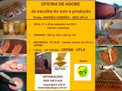 Neste final de semana - sábado e domingo (27/9 e 28/9) - a professora do Departamento de Engenharia da Universidade Federal de Lavras (DEG/UFLA) Andréa Corrêa irá ministrar a “Oficina de Adobe: da escolha do solo à produção”, das 9h às 12h e das 14h às 17h, na Unidade Experimental em Painéis de Madeira (Uepam).