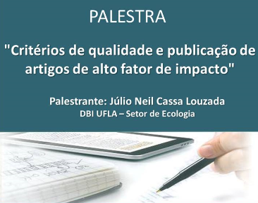 O Núcleo de Estudos em Entomologia (Neento) promove nesta terça-feira (30) a palestra “Critérios de qualidade e publicação de artigos de alto fator de impacto”. A palestra será proferida pelo professor Júlio Neil Cassa Louzada, às 17 horas, no anfiteatro do Departamento de Entomologia (DEN). As inscrições poderão ser feitas no local (gratuita para membros do Neento e R$ 5,00 para demais participantes).