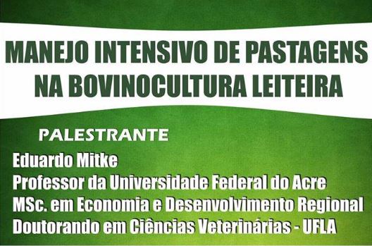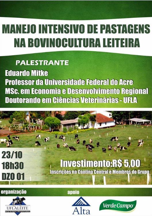 O Grupo de Apoio à Pecuária Leiteira (UFLALeite), da Universidade Federal de Lavras (UFLA), proverá no dia 23/10 a palestra “Manejo Intensivo de pastagens na bovinocultura leiteira”. As inscrições para o evento estão sendo feitas na Cantina Central, das 8h às 16h. O investimento é de R$ 5,00. Também é possível inscrever-se com o professor Geraldo Márcio da Costa, diretamente no Departamento de Zootecnia (DZO).