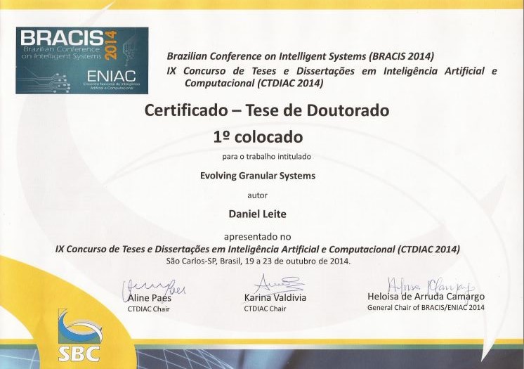 O professor Daniel Furtado Leite do Departamento de Engenharia da Universidade Federal de Lavras (DEG/UFLA) teve sua tese de doutorado contemplada com o primeiro lugar no “IX Concurso de Teses e Dissertações em Inteligência Artificial e Computacional” (CTDIAC 2014). O concurso faz parte da Conferência Conjunta de Robótica e Sistemas Inteligentes (Joint Conference on Robotics and Intelligent Systems) que este ano foi realizada de 18/10 a 23/10 em São Carlos, SP.