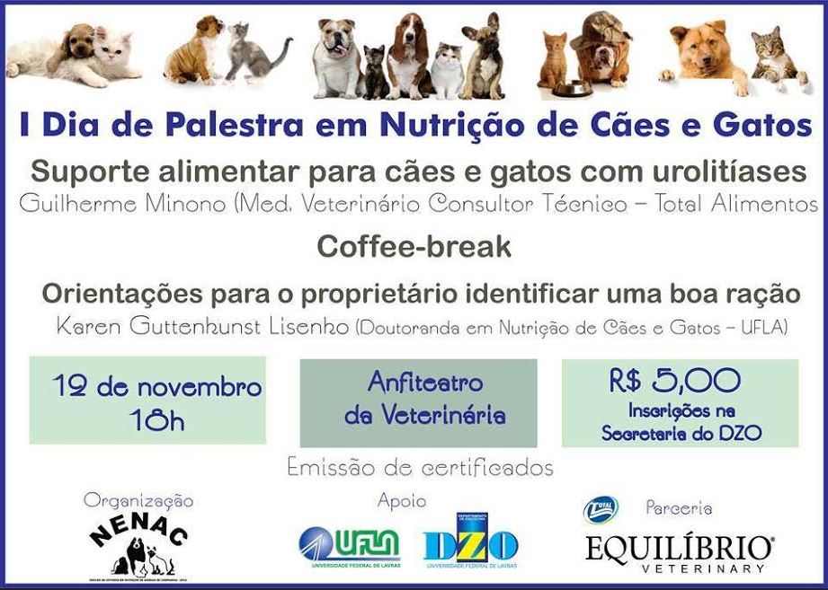 Será realizado no dia 12 de novembro o I Dia de Palestra em Nutrição de Cães e Gatos, no anfiteatro do Departamento de Medicina Veterinária (DMV), às 18h. O evento está sendo organizado pelo Núcleo de Estudos em Nutrição de Animais de Companhia (Nenac).