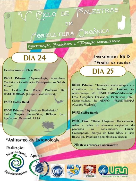 Nos dias 24/11 e 25/11 será realizado na Universidade Federal de Lavras (UFLA) o V Ciclo de Palestras em Agricultura Orgânica. As inscrições estão sendo feitas na Cantina Central, mediante um investimento de R$ 15,00. As atividades serão desenvolvidas no período da noite, tendo como tema norteador “Certificação, biodinâmica e transição agroecológica”. O local de realização é o Anfiteatro da Entomologia.