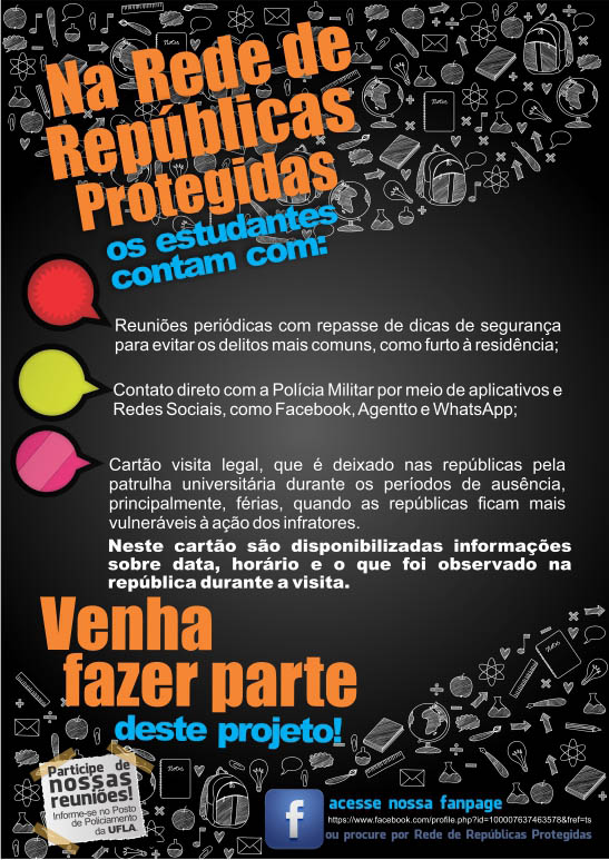 As férias de final de ano se aproximam e, durante este período, muitos estudantes ausentam-se de Lavras. Para ajudar a manter a segurança dos domicílios na ausência dos estudantes moradores, o 8º Batalhão da Polícia Militar de Minas Gerais, sediado em Lavras, criou a Rede de Repúblicas Protegidas, que já monitora mais de 40 residências na cidade. No dia 26/11, uma nova reunião será feita, com os estudantes que quiserem aderir a este programa. A reunião será no Anfiteatro da Biblioteca, às 19 horas.