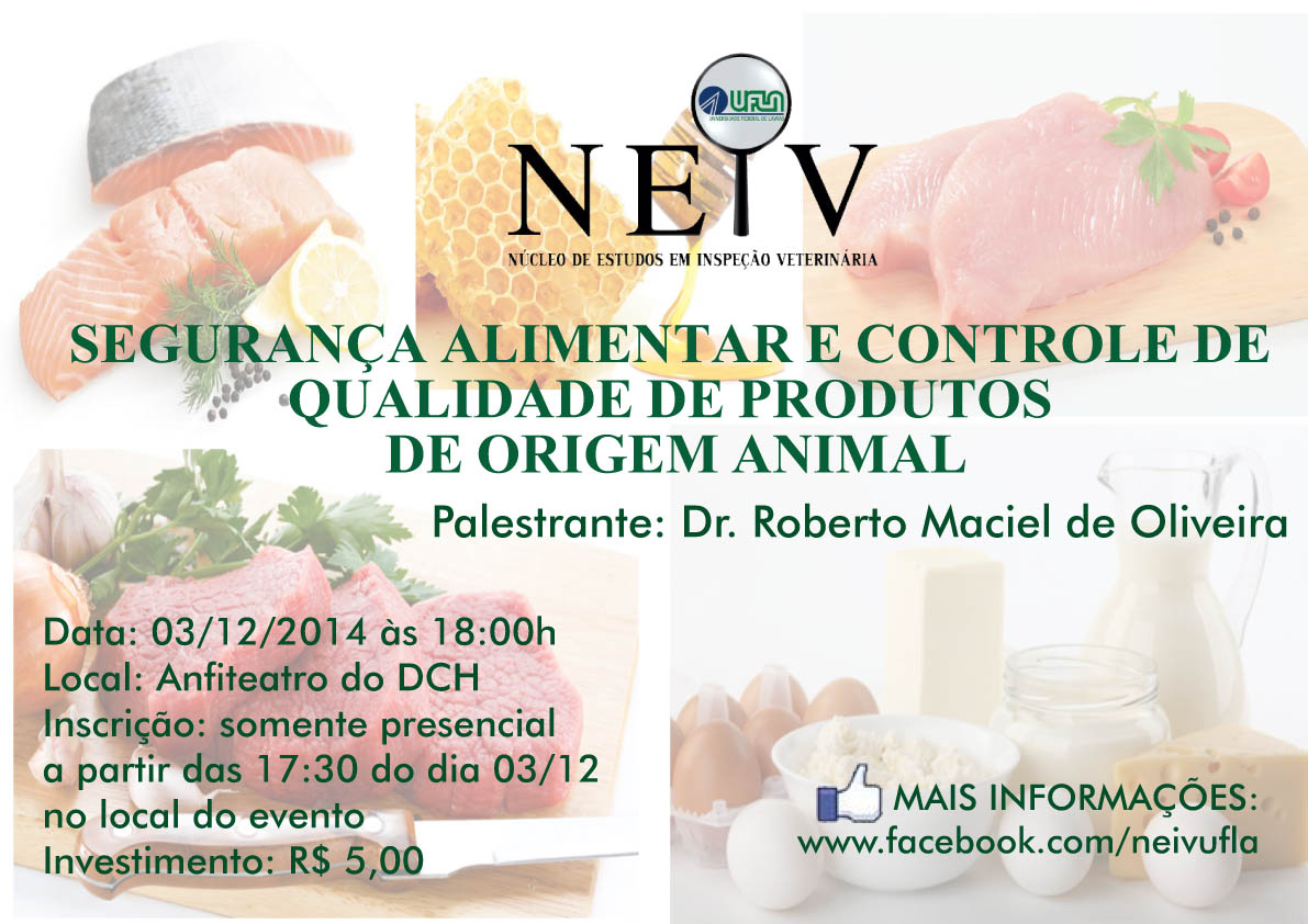 A segurança alimentar e o controle de qualidade de produtos de animal serão temas de palestra no dia 3/12, às 18 horas, no Anfiteatro do Departamento de Ciências Humanas (DCH). O convidado para ministrar esta palestra é o professor Roberto Maciel de Oliveira (DZO).