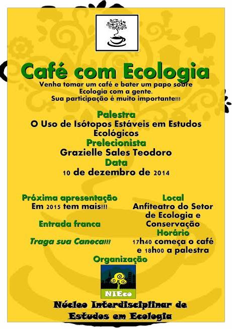 A última palestra do encontro “Café com Ecologia” será nesta quarta-feira (10/12). O evento organizado pelo Núcleo Interdisciplinar de Estudos em Ecologia (Nieco) tratará do tema “O uso de isótopos estáveis em estudos ecológicos”, tendo como prelecionista a pós-doutoranda do Programa de Pós-Graduação em Ecologia Aplicada da UFLA Grazielle Sales Teodoro.