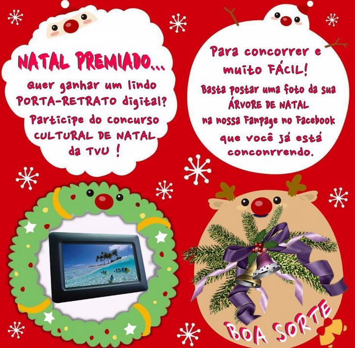 A TV Universitária (TVU) lançou no dia 2/12 um concurso cultural de Natal. Os internautas estão sendo convidados a postar na linha do tempo da emissora, no Facebook, fotos de árvores de Natal. Aquela que for eleita a árvore mais bonita ganhará um porta-retrato digital.